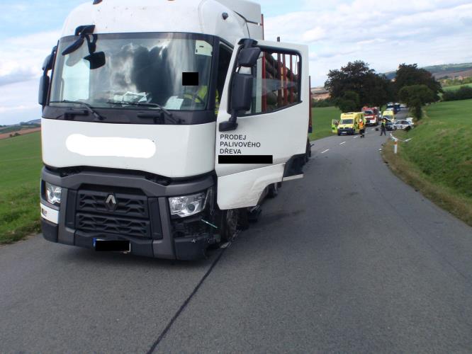 Jednadvacetiletá řidička BMW v levotočivé zatáčce v úseku klesání nepřizpůsobila rychlost jízdy, dostala smyk a v protisměru se bočně střetla s nákladní soupravou převážející dřevo. Nárazem byl osobní vůz odhozen mimo komunikaci. Řidička a její osmnácitletý spolujezdec byli zraněni lehce, řidič nákladní soupravy vyvázl bez zranění. Škoda na osobním voze dosáhla šedesát tisíc korun, na nákladní soupravě sto deset tisíc korun.