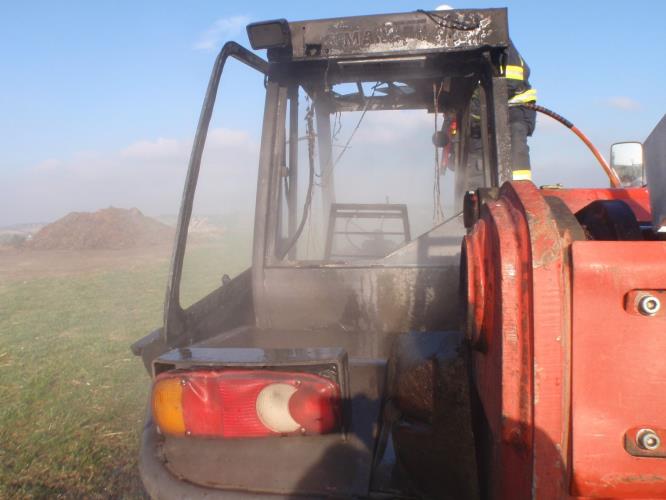 Dobrovolní hasiči dorazili na místo také jako první a okamžitě zahájili hasební zásah. Spolu s profesionálními hasiči, a za použití dvou útočných proudů, se jim podařilo požár asi za třicet minut zlikvidovat. Vlivem hoření došlo k poškození hadic hydrauliky nakladače. Unikající olej hasiči likvidovali za pomocí sorbentů.