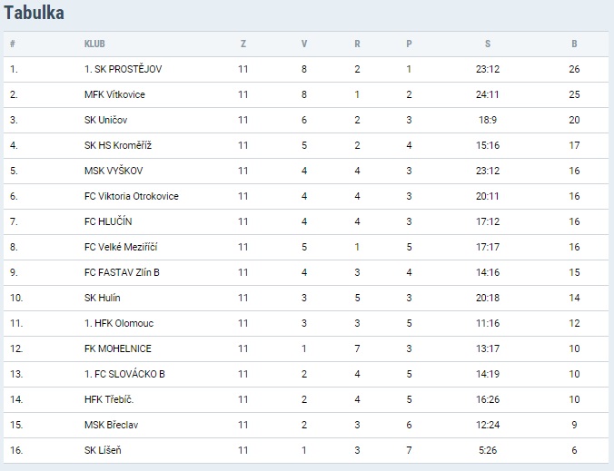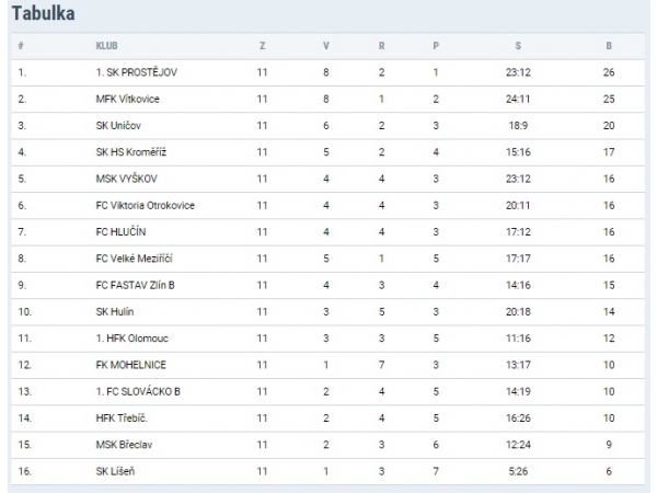 Jedenácté letošní utkání Hanácké Slavii Kroměříž nevyšlo podle představ. Z Uničova si přivezli remízu 1:1, která se zrodila ve druhém poločasu běhěm dvou minut. V rozmezí 69. a 71. minuty svěřenci Vlastimila Chytrého prohrávali 1:0, ale vzápětí se jim podařilo vyrovnat. V příštím utkání se představí na domácím trávníku v sobotu 17. října s Třebíčí.