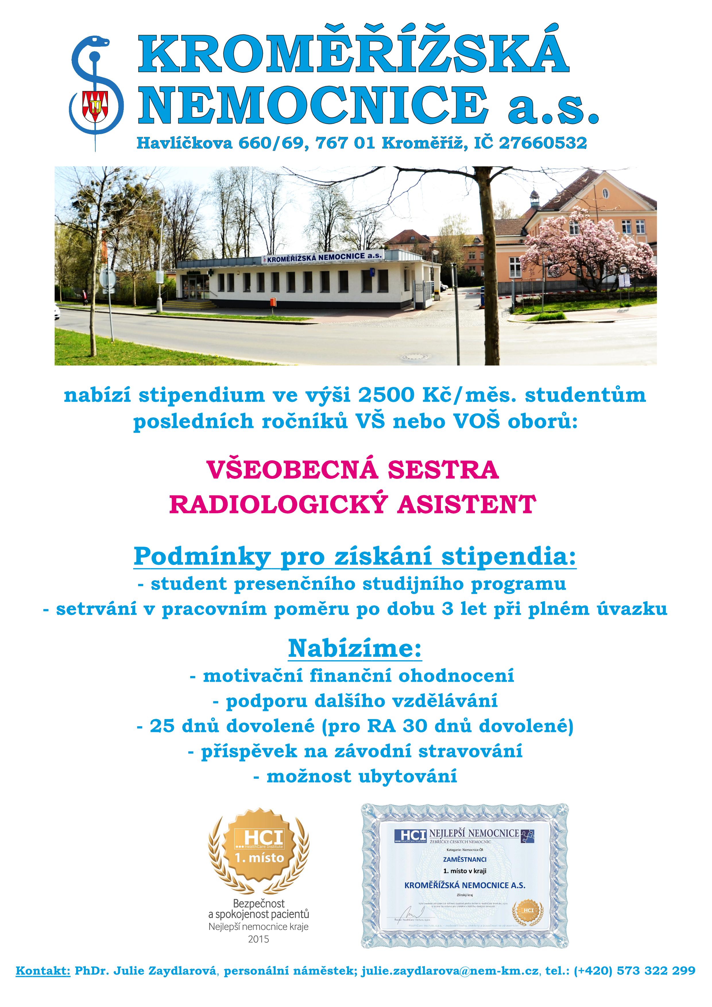 Nový stipendijní program nabízí Kroměřížská nemocnice. Na částku 2500 Kč měsíčně si mohou v následujícím školním roce sáhnout studenti posledních ročníků vysokých nebo vyšších odborných škol v oborech všeobecná sestra nebo radiologický asistent.