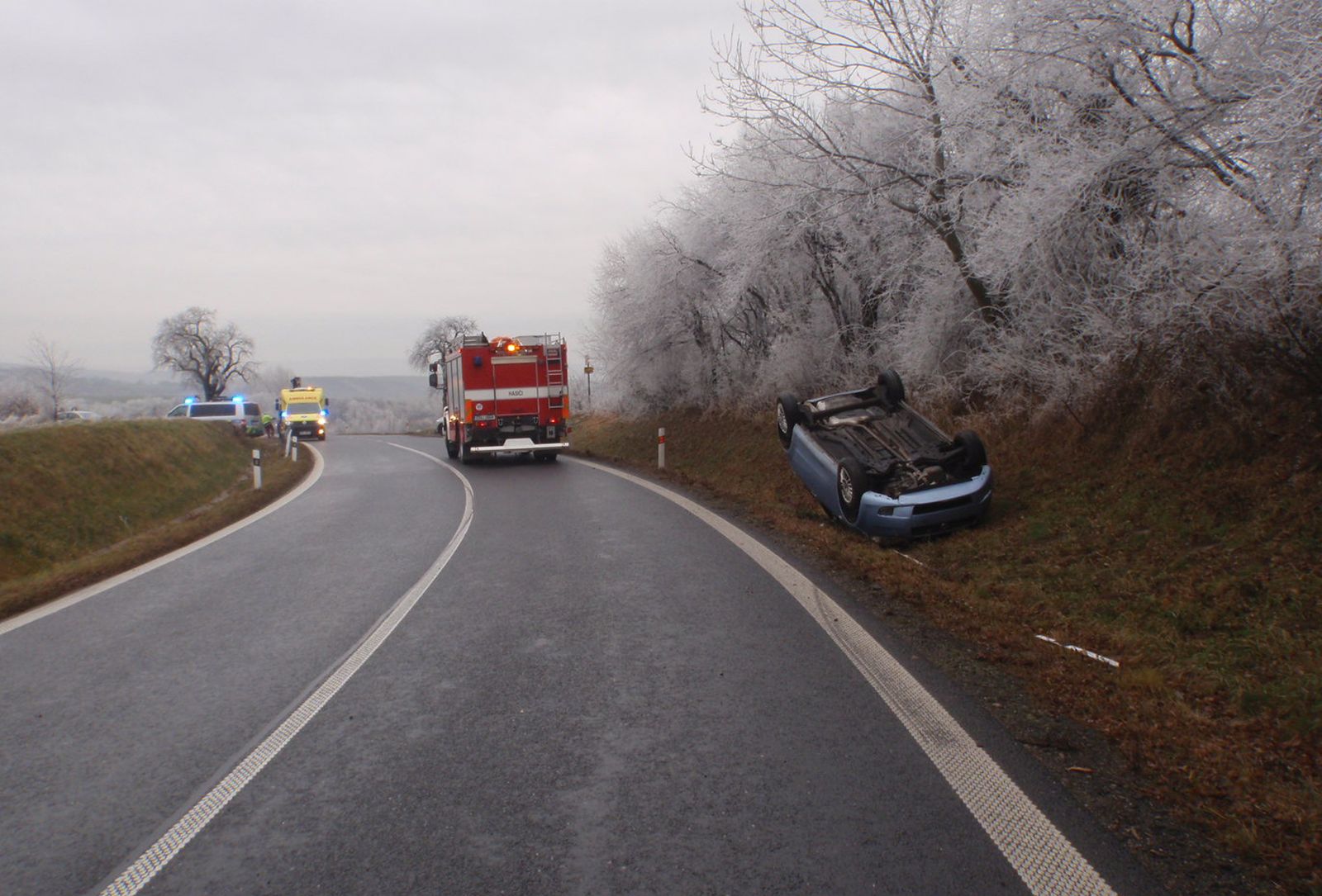 Auto značky Fiat Punto skončilo převrácené na střeše za krajnicí cesty mezi obcemi Cetechovice a Střílky: řidička naštěstí vyvázla bez zranění.