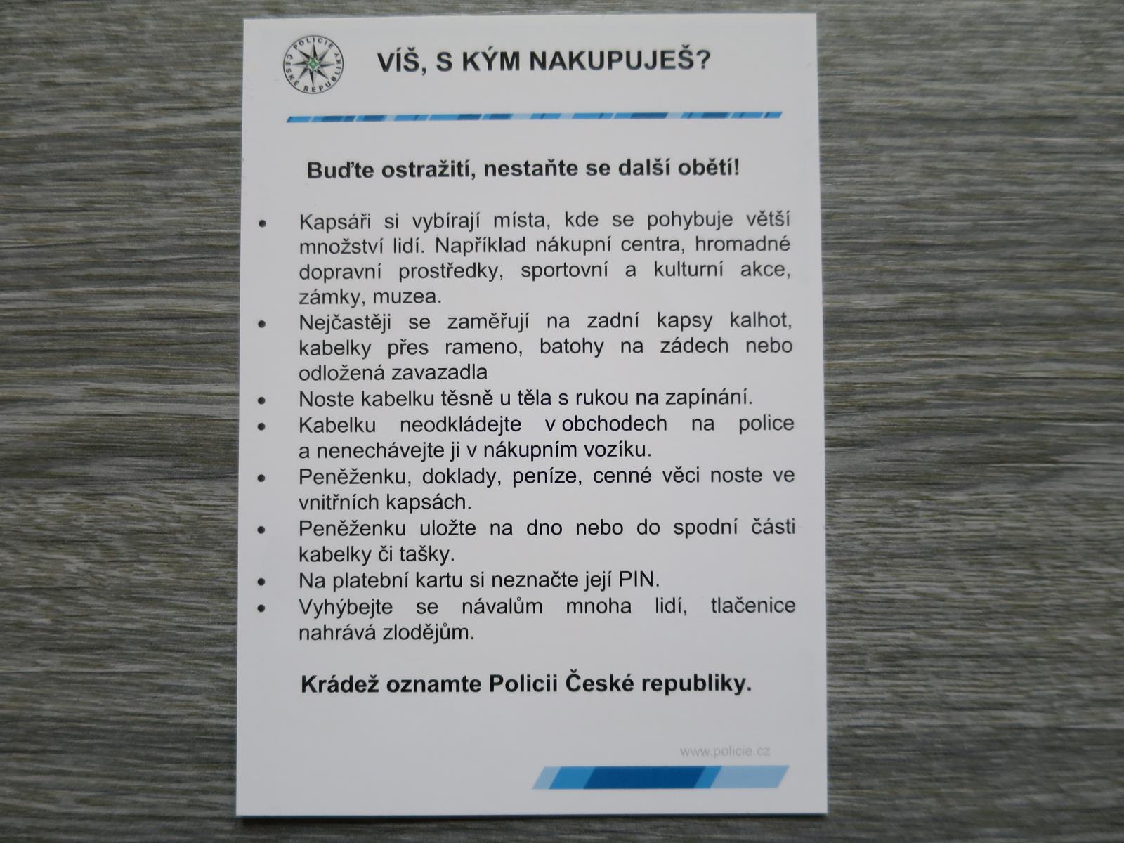 Přítomné varovaly před kapsáři a upozorňovaly je na to, aby u sebe nenosili zbytečně velkou finanční hotovost, peněženku a jiné cennosti nenechávali navrchu tašek či kabelek, tyto neodkládali do nákupních košíků a aby věnovali pozornost osobám v jejich okolí.