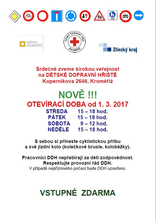 Kroměřížské dětské dopravní hřiště v Koperníkově ulici je od 1. března po zimní pauze opět k dispozici zájemcům. Ke středečním a pátečním odpoledním, kdy v minulých letech bývalo otevřeno pro veřejnost, přibyly ještě dva termíny, kdy může kdokoliv na dopravní hřiště přijít s kolem, koloběžkou nebo třeba s kolečkovými bruslemi, a to sobotní dopoledne a nedělní odpoledne.