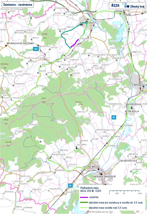 Na silnici II/432 z Kroměříže do Kyjova v úseku Jarohněvice - Šelešovice bude v pondělí 8. července zahájena rekonstrukce povrchu vozovky. Kvůli opravám bude silnice pro osobní i nákladní vozy úplně uzavřena a doprava povede po objízdných trasách. Uzavírka potrvá od 8. července až do 15. září 2013. Objízdná trasa pro osobní automobily a autobusy vede z Kroměříže přes Rataje do Šelešovic. Vozidla s váhou nad 3,5 tuny budou muset využít objížďku přes Hulín, Otrokovice , Napajedla, Staré Město s cílovým bodem u křižovatky silnice E/50 u Střílek.