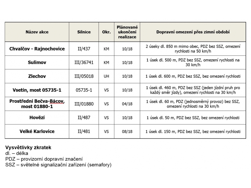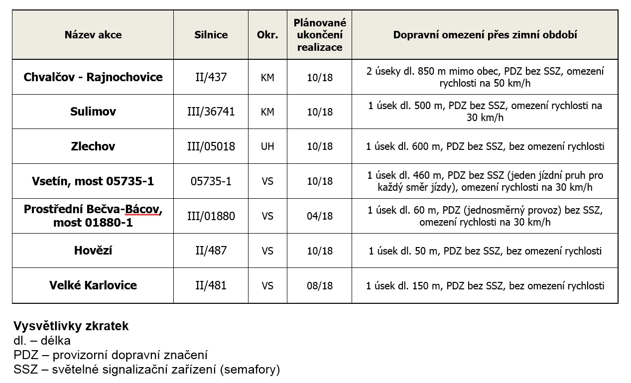 „V listopadu a v první polovině prosince je dokončována většina našich letošních investičních staveb. Sedm akcí však pokračuje do dalšího roku. Přes zimní období budou práce na stavbách z technologických důvodů přerušeny a pokračovat budou opět na jaře, jakmile to dovolí počasí,“ řekl ředitel ŘSZK Ing. Bronislav Malý. Plánovaná zimní dopravní omezení na krajské silniční síti jsou již zveřejněna na webu ŘSZK v databázi uzavírek.