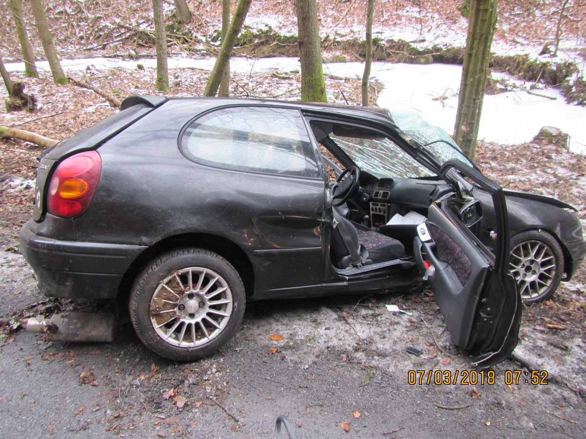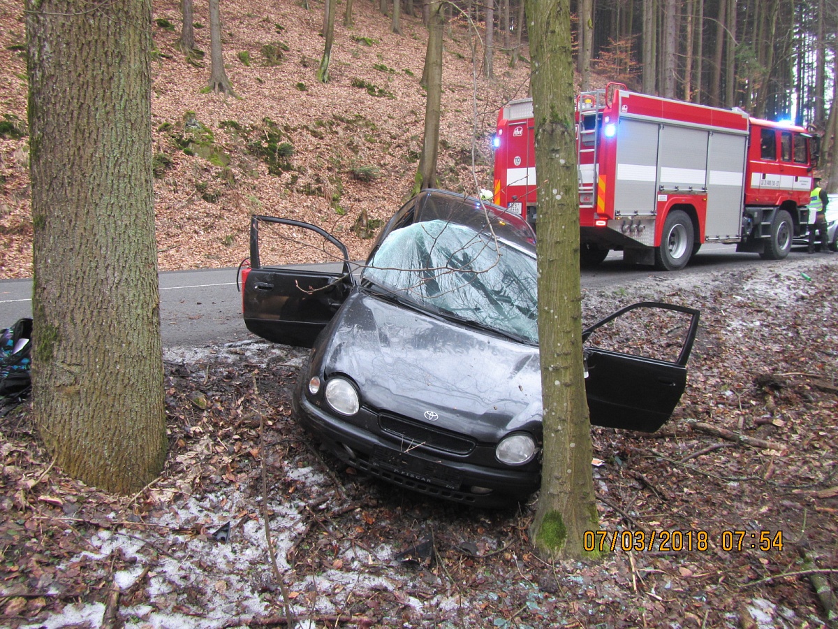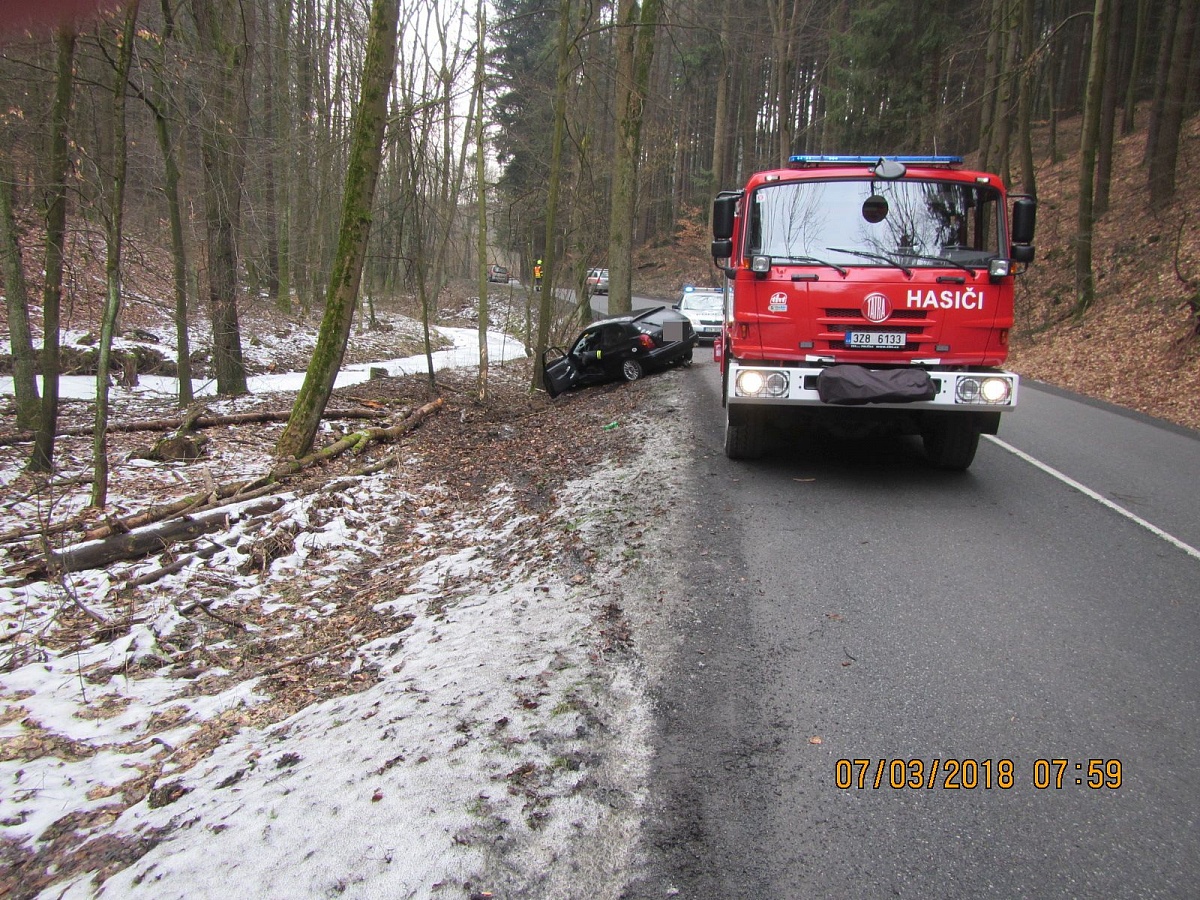 Havarované auto bylo zaklíněno do stromu a zadní částí vyčnívalo do komunikace. Řidič i jeho spolujezdkyně z vozidla sami vystoupili. Stěžovali si však na bolesti. Proto na místo byli přivoláni záchranáři. Ti si po svém příjezdu vzali do své péče obě osoby. Nakonec je k dalšímu vyšetření převezli do krajské nemocnice.
