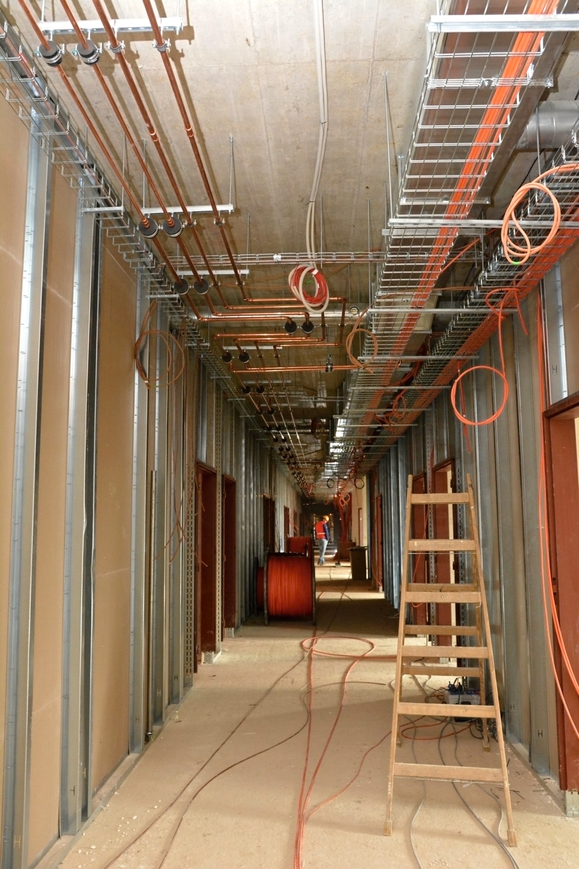 „Pokračuje zdění obvodového zdiva v 5. a 6. nadzemním podlaží, montáž oken, sádrokartonových příček a hrubých elektrorozvodů i medicinálních plynů. Minulý týden byla rovněž zahájena montáž fasádních panelů spojovacího krčku mezi budovami centrálního objektu chirurgických oborů a plicním pavilonem,“ popsal aktuální situaci projektový manažer UHN Ing. Pavel Lečbych a dodal, že pokud půjde vše podle plánu i nadále, budova by měla být hotová letos na podzim a stěhování proběhne v listopadu.