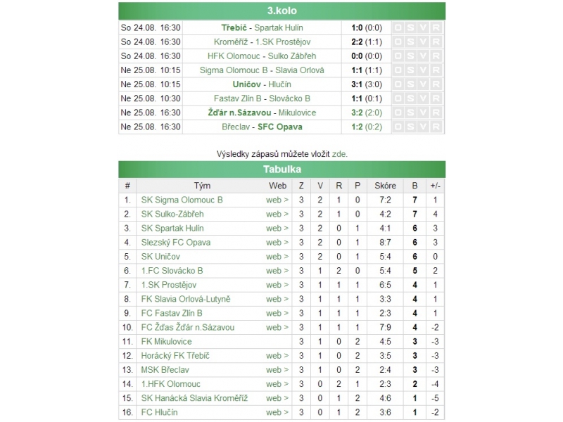 Fotbalisté Kroměříže oslavili ve třetím kole MSFL zisk premiérového bodu v soutěži. V domácím utkání jej vydřeli proti Prostějovu. Naopak poprvé v této sezoně vyšel střelecky a bodově naprázdno Hulín, který podlehl nováčkovi z Třebíče. V příštím kole v sobotu 31. srpna od 16:30 čeká tabulkově třetí Spartak Hulín derby s kroměřížskými hanáky.