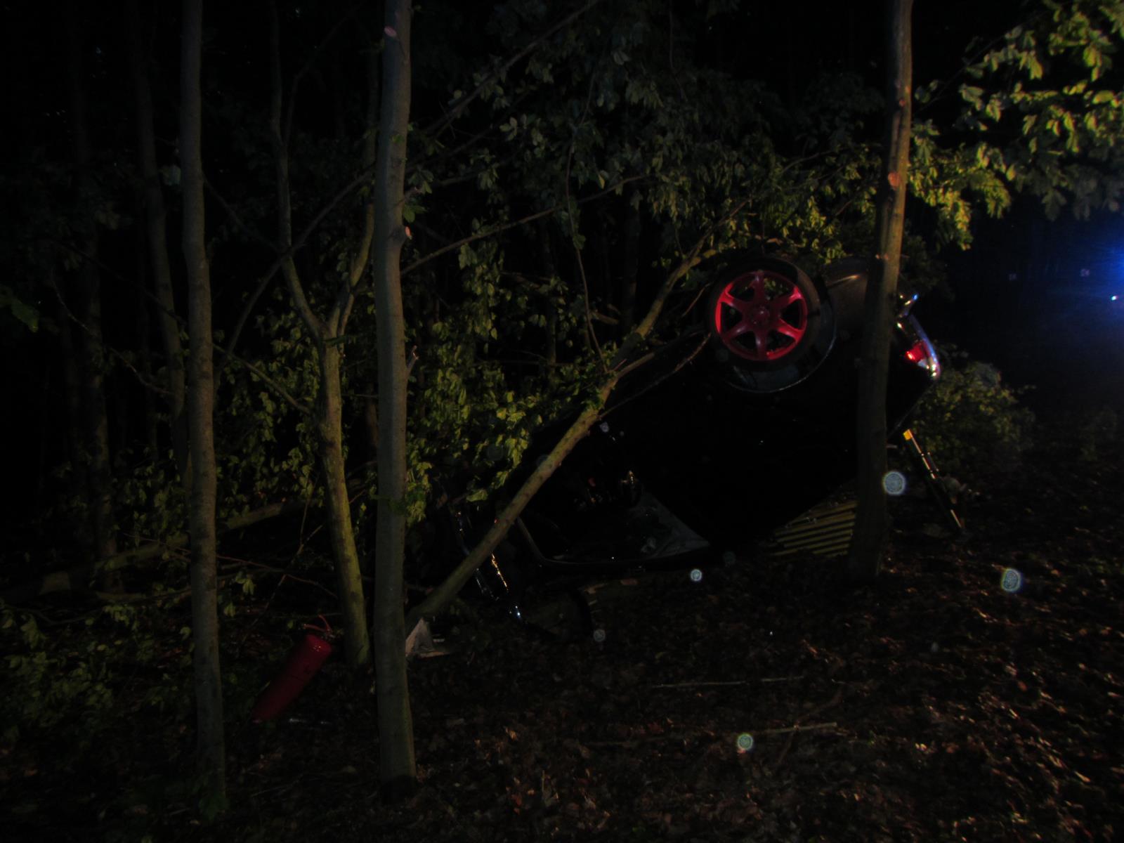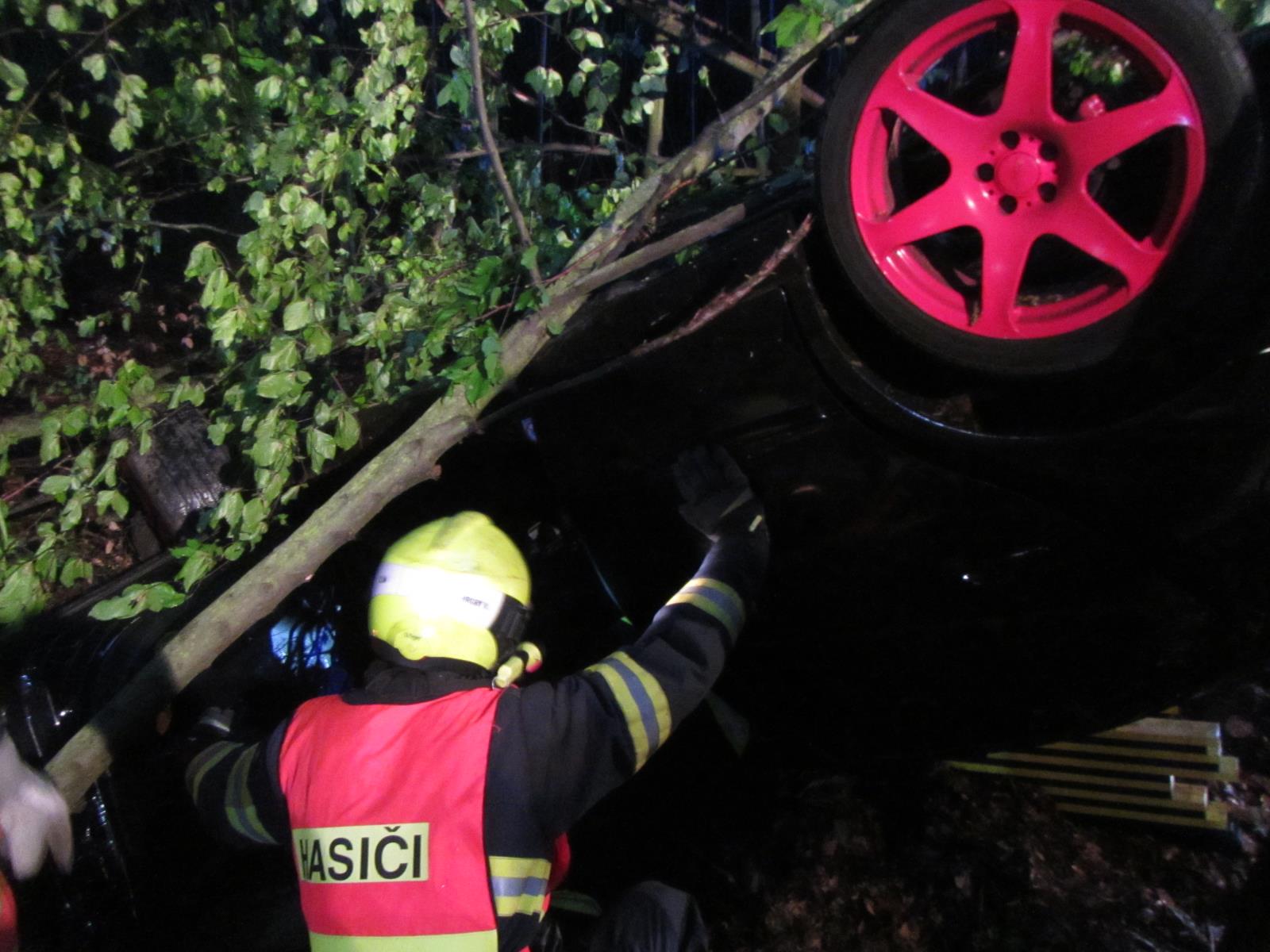 Po příjezdu na místo hasiči průzkumem zjistili, že osobní vozidlo je na střeše mimo komunikaci. Řidič vozidla byl zaklínění uvnitř auta a spolujezdec se sám z vozidla dostal ven.