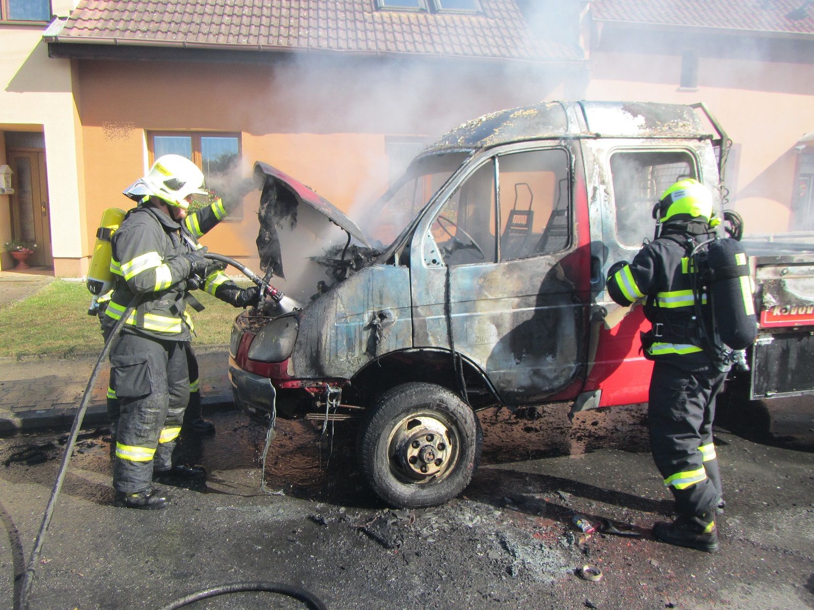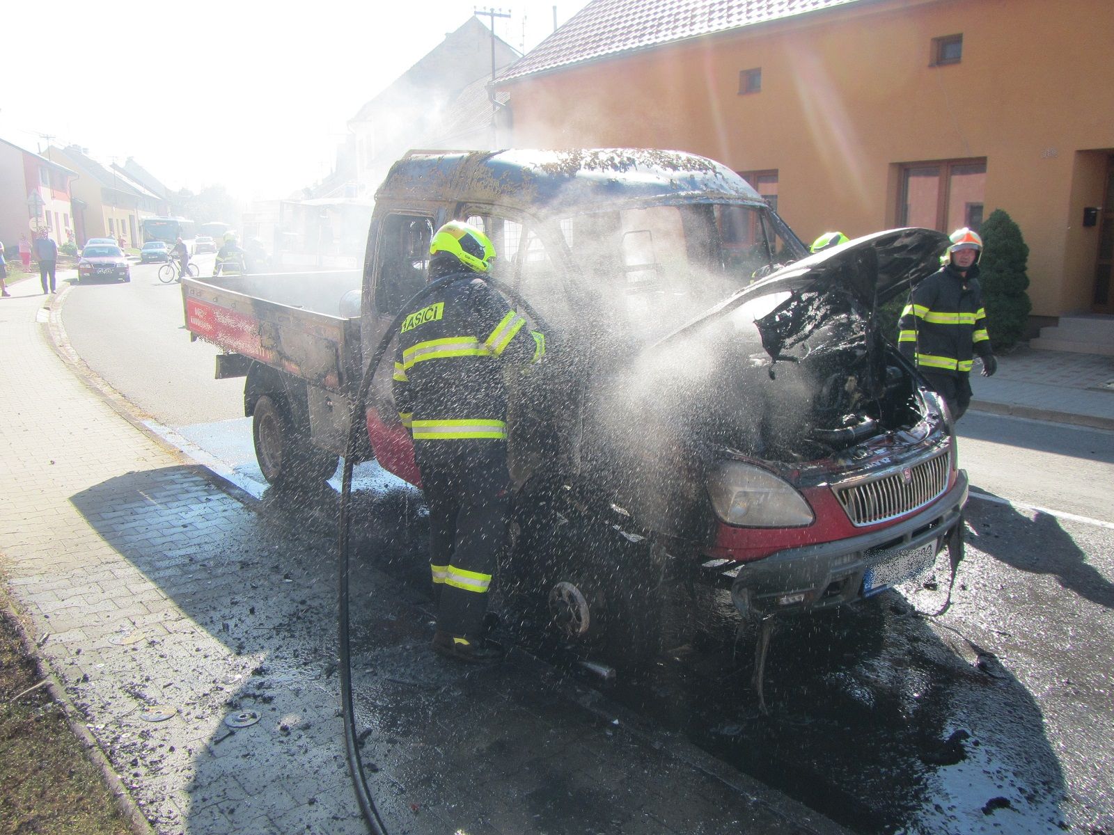 V době příjezdu první jednotky bylo vozidlo celé v plamenech. Požár byl uhašen dvěma vysokotlakými proudy vody. Silnice, procházející obcí, byla po dobu hasebního zásahu zcela uzavřena. Po uhašení požáru hasiči usměrňovali dopravu v jednom jízdním pruhu.