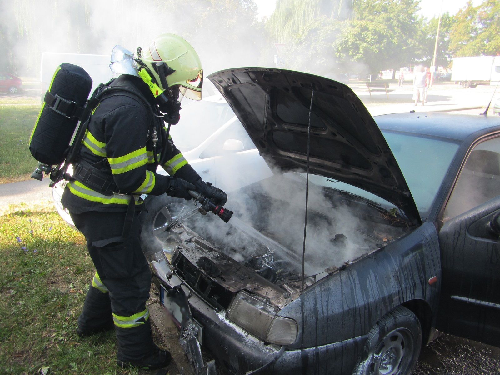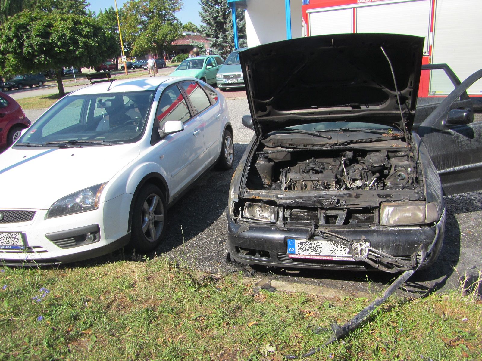 Hořící osobní automobil stál na parkovišti v blízkosti supermarketu mezi dalšími zaparkovanými automobily. Po úspěšném uhašení se tým hasičů dozvěděl, že ještě před jejich příjezdem se pokusila vznikající požár uhasit hlídka Městské policie Otrokovice s jedním hasicím přístrojem. To se jim sice nepodařilo, ale svým zásahem omezili šíření plamenů a ochránili tak okolo stojící automobily.