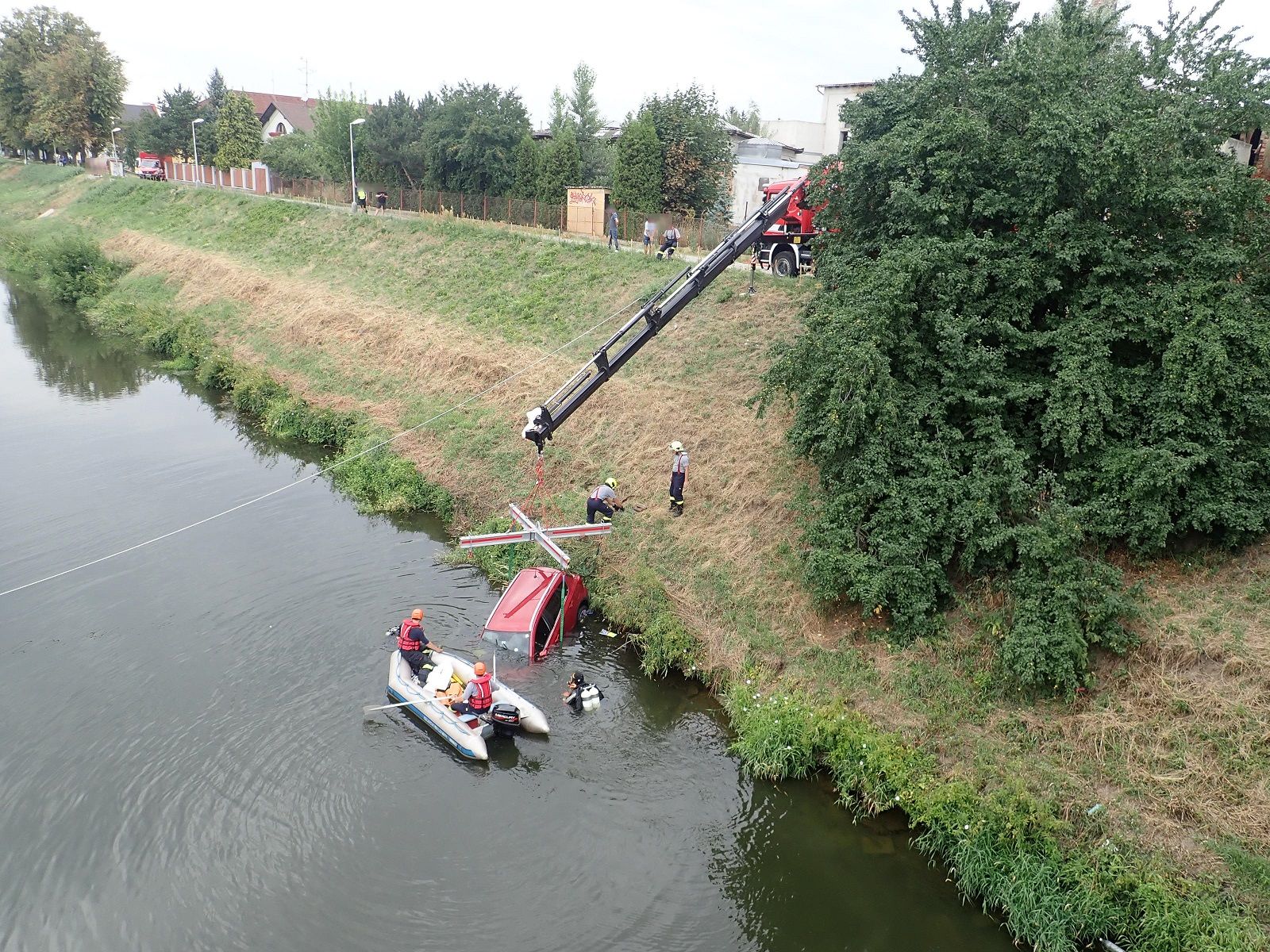 Majitel červeného osobního automobilu vyjížděl ze svého pozemku na ulici Zborovská v Kroměříži. Při vysedání z auta pravděpodobně nedostatečně zatáhl ruční brzdu automobilu, a ten sjel do blízké řeky. Hasiči se pokoušeli zajistit automobil, který skončil v místech poblíž železničního mostu přes řeku Moravu.