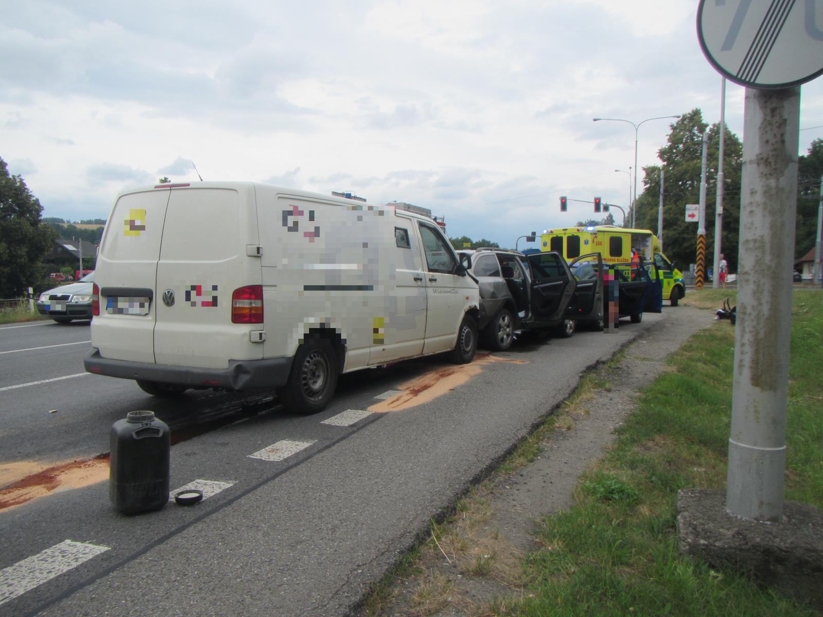 Hasiči u havarovaných vozidel provedli protipožární opatření a zasypali sorbentem uniklé provozní kapaliny.