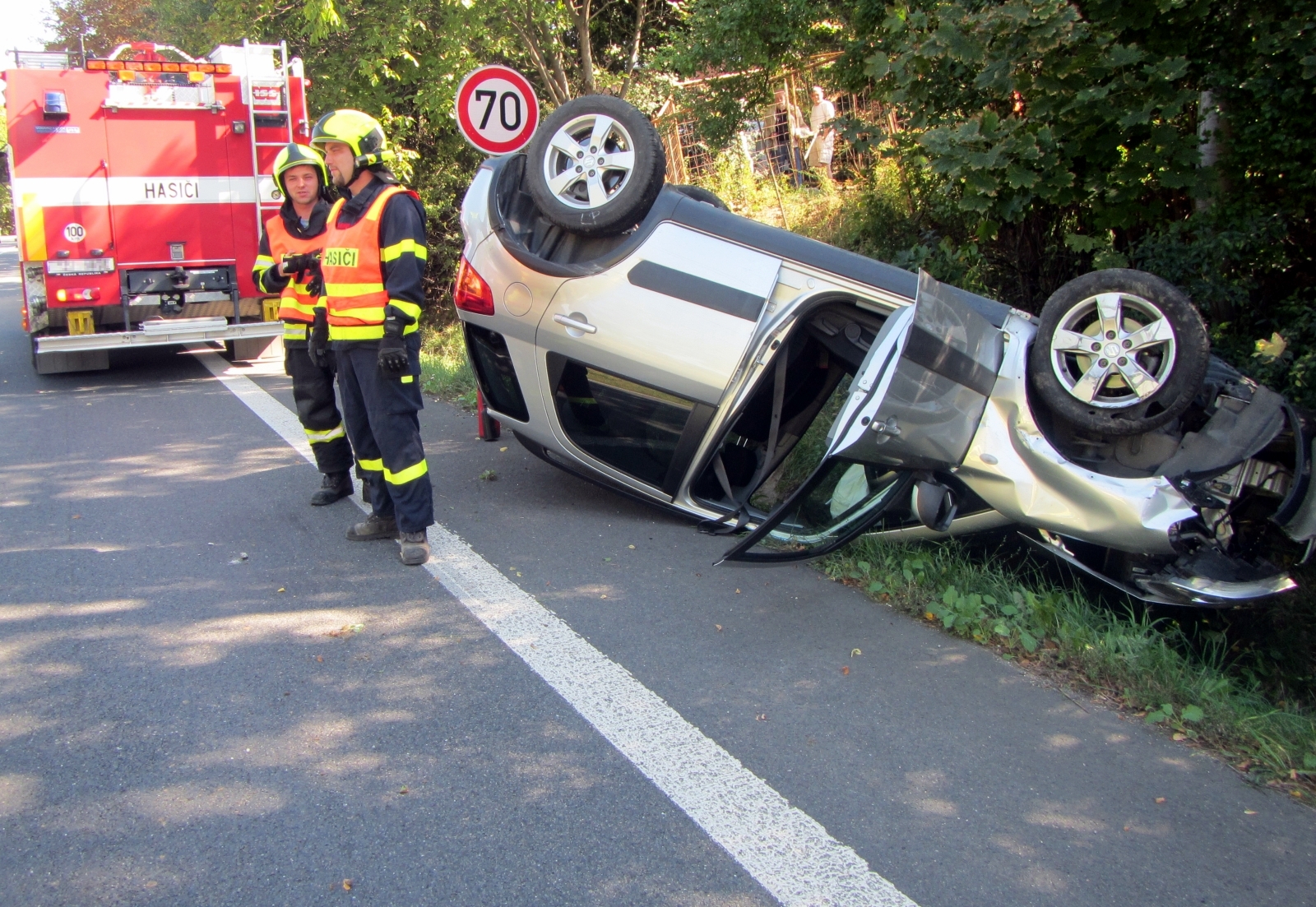 Jednotka byla na místě během tří minut od vyhlášení poplachu. Ocitli se tak u osobního vozidla, které leželo převrácené na střeše a částečně mimo vozovku. Hasiči okamžitě zajistili místo havárie a zabezpečili vůz proti nebezpečí vzniku požáru. Zraněná osoba byla po prvotním ošetření odvezena přivolanou posádkou zdravotnické záchranné služby do nemocnice.