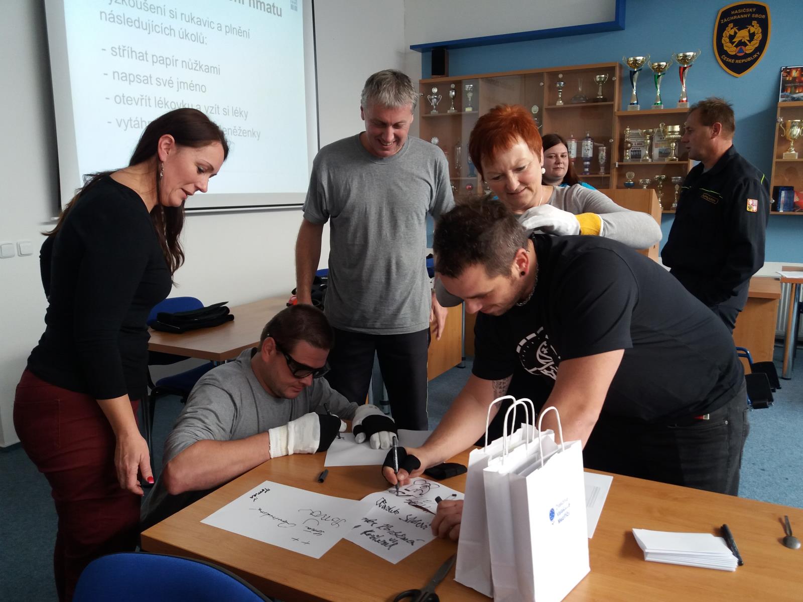 Hasiči měli možnost vyzkoušet si oblek, simulující zdravotní a smyslové obtíže a handicapy seniorů. Pod vedením sociálních pracovnic DIAKONIE a psycholožky Hasičského záchranného sboru Zlínského kraje si hasiči osvojovali přístupy k handicapovaným seniorům při různých zásahových činnostech.