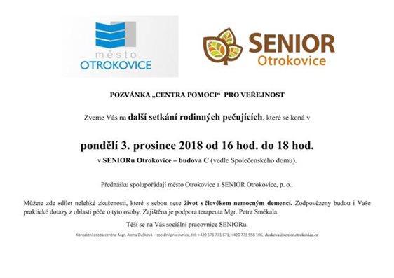 Rodinní příslušníci pečující o seniory s demencí mohou opět využít bezplatnou pomoc. V SENIORU Otrokovice funguje od roku 2015 CENTRUM POMOCI, jehož cílem je pomáhat lidem s demencí a jejich rodinným pečujícím. V pondělí 3. prosince 2018 se uskuteční od 16 do 18 hodin další setkání rodinných pečujících v SENIORU Otrokovice, budově C, vedle Společenského domu.
