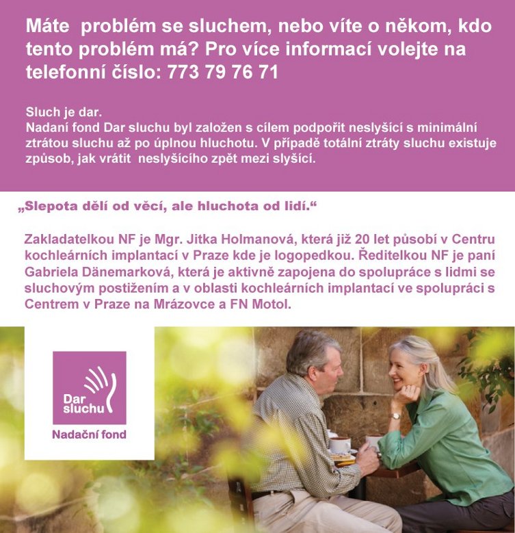 Akce se koná pod patronací nadačního fondu Dar sluchu. Vyšetření je zdarma, neplatí se ani regulační poplatek. Na vyšetření je nutné se objednat na tel.: 773 79 76 71.
