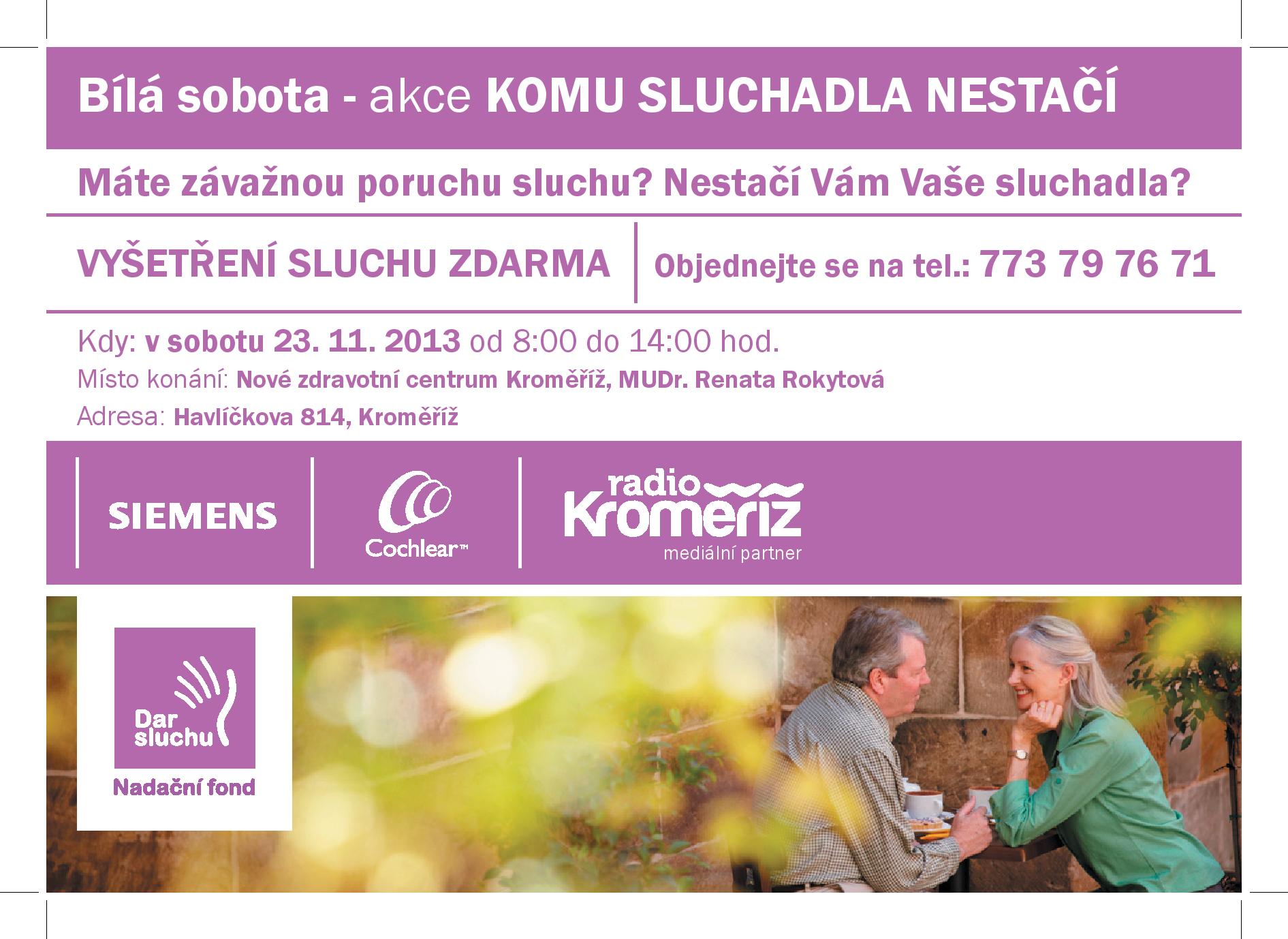 V sobotu 23. listopadu se v Novém zdravotním centru v Kroměříži u nemocnice na rohu Albertovy a Havlíčkovy ulice (v patře nad restaurací) uskuteční od 8 do 14 hodin akce, během níž si můžete nechat vyšetřit sluch nebo nechat zkontrolovat stav svých sluchadel.