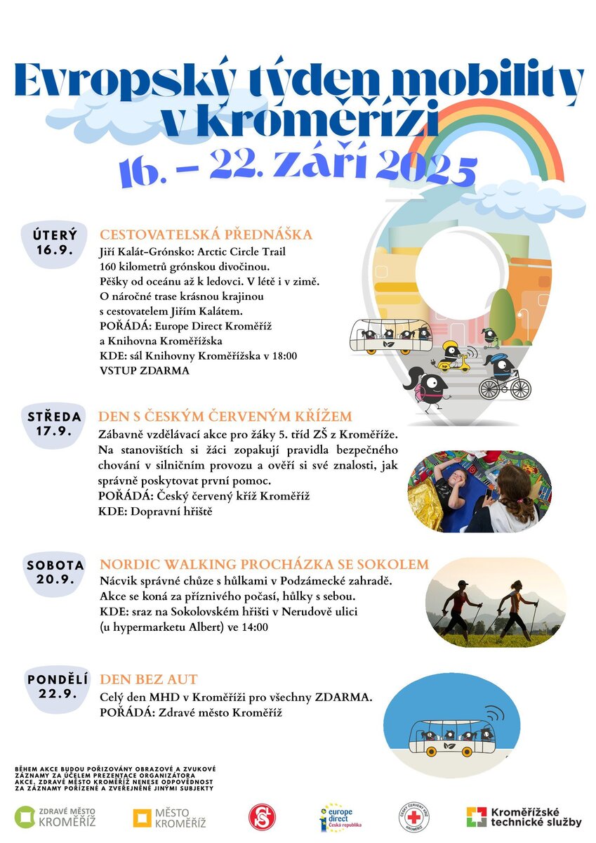 Program kroměřížského týdne mobility zahájí v úterý 16. září cestovatelská přednáška v Knihovně Kroměřížska. Jiří Kalát pozve na 160 kilometrů dlouhou cestu grónskou divočinou v povídání s názvem Grónsko: Arctic Circle Trail. Středa 17. září bude Dnem s Českým červeným křížem. Na dětském dopravním hřišti se uskuteční zábavně vzdělávací akce pro žáky pátých tříd kroměřížských škol, kde si budou moci zopakovat pravidla bezpečného chování v silničním provozu i znalosti poskytování první pomoci. V sobotu 20. září se mohou zájemci vydat na Nordic Walking procházku se Sokolem. Program zahrnuje nejen putování Podzámeckou zahradou, ale i nácvik správné chůze s hůlkami, které si každý účastník musí přinést s sebou. Vrcholem týdne mobility je tradičně Den bez aut, který připadne na pondělí 22. září. Po celý tento den bude cestujícím v Kroměříži k dispozici MHD zdarma.