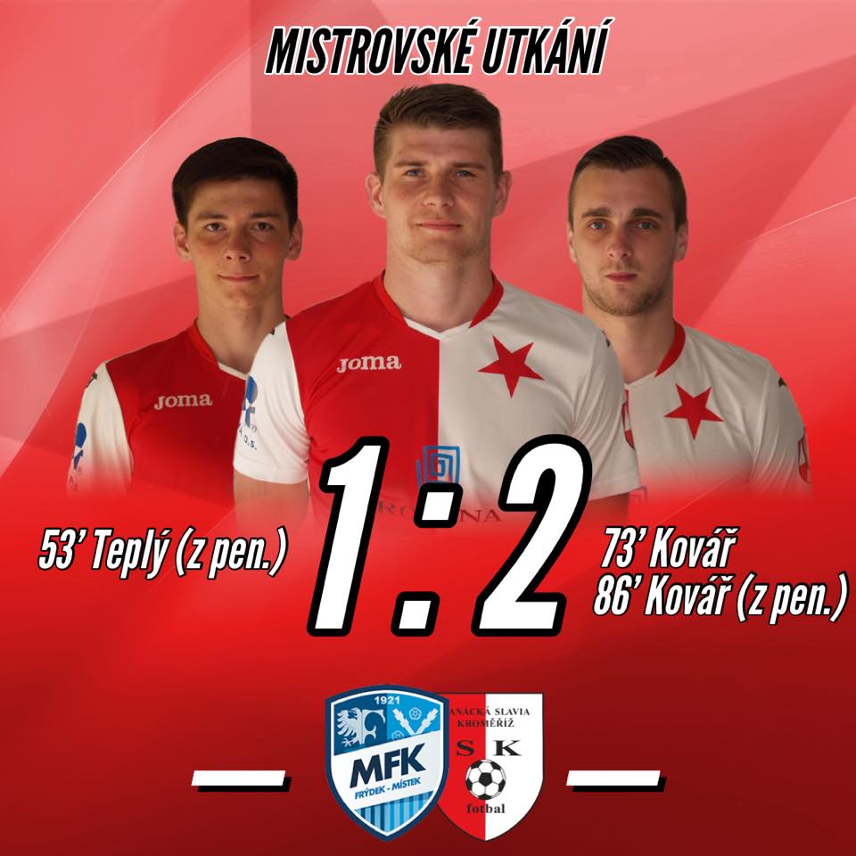 První branku zaznamenali domácí v 53. minutě z penalty. Po přestávce již brankově úřadovali jen Hanáci, resp. Kovář, který v 73. minutě srovnal skóre a 4 minuty před koncem zajistil Kroměříži tři body.